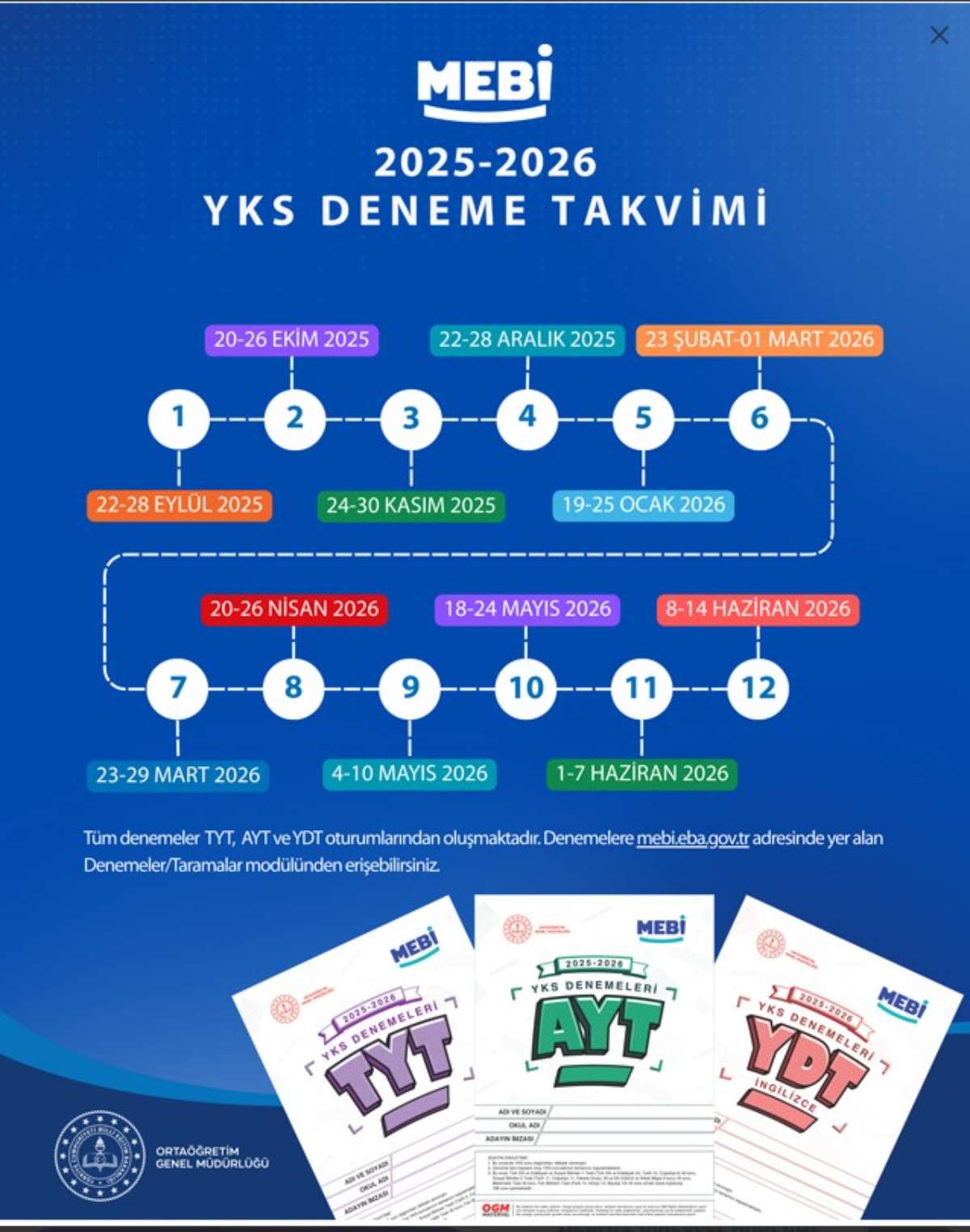 Milli Eğitim Bakanlığı tarafından 2025-2026 eğitim öğretim yılı için YKS Deneme Takvimi açıklanmıştır. Öğrencilerimizin sınavlara daha iyi hazırlanabilmesi amacıyla, yıl boyunca 12 deneme sınavı uygulanacaktır.