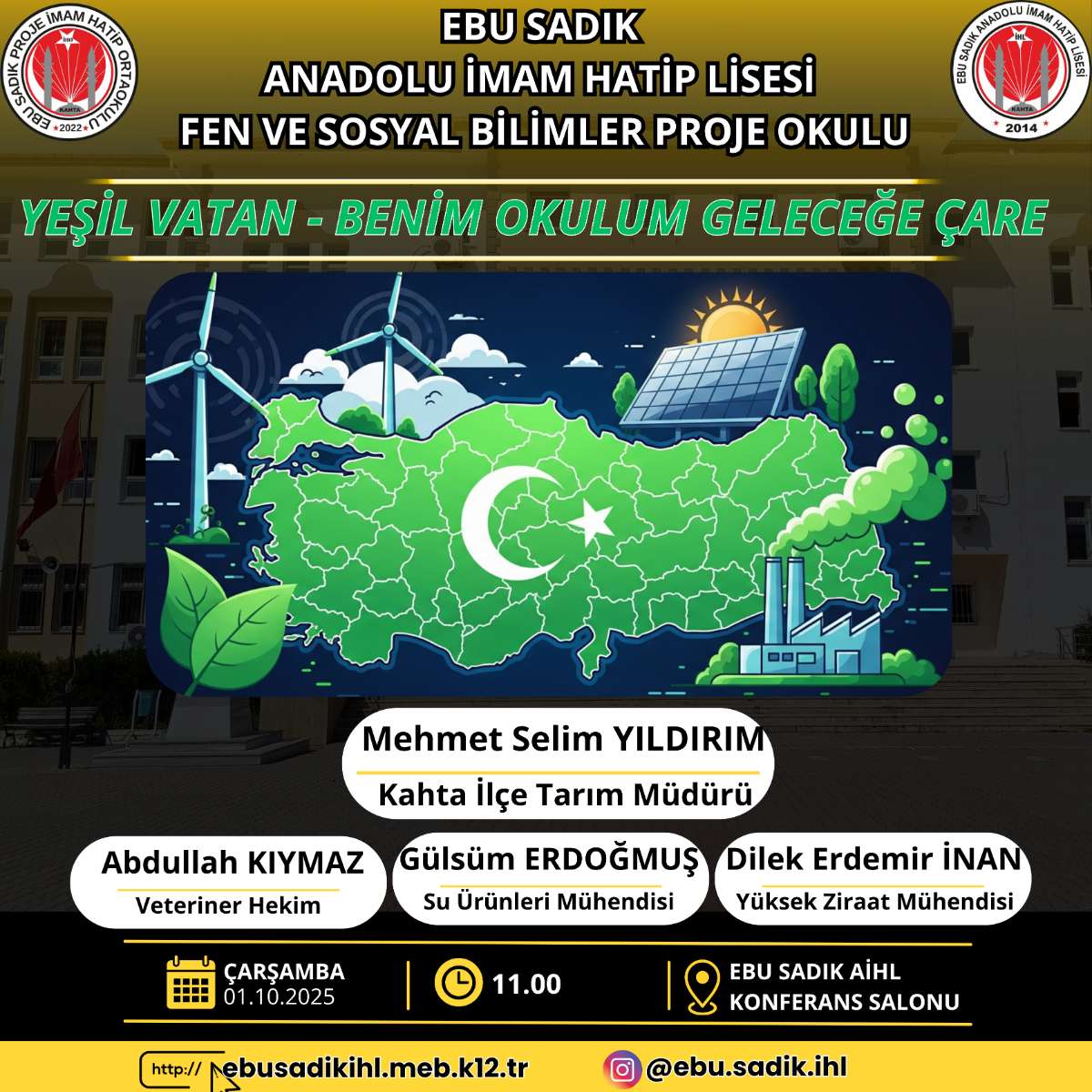 Ebu Sadık Anadolu İmam Hatip Lisesi Fen ve Sosyal Bilimler Proje Okulu’nda, çevre bilinci ve sürdürülebilir gelecek temalı “Yeşil Vatan - Benim Okulum Geleceğe Çare” etkinliği gerçekleştirildi.